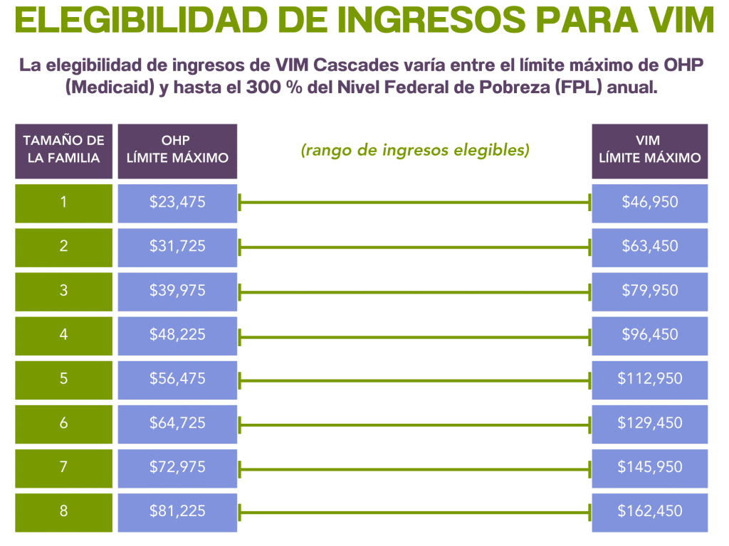 La elegibilidad del paciente depende de varios aspectos, como sus ingresos, el tamaño de su hogar, su elegibilidad para Medicaid y otros factores. Le recomendamos que nos llame al 541-330-9001 para hablar sobre su situación particular y ver si califica como paciente de VIM Cascades.